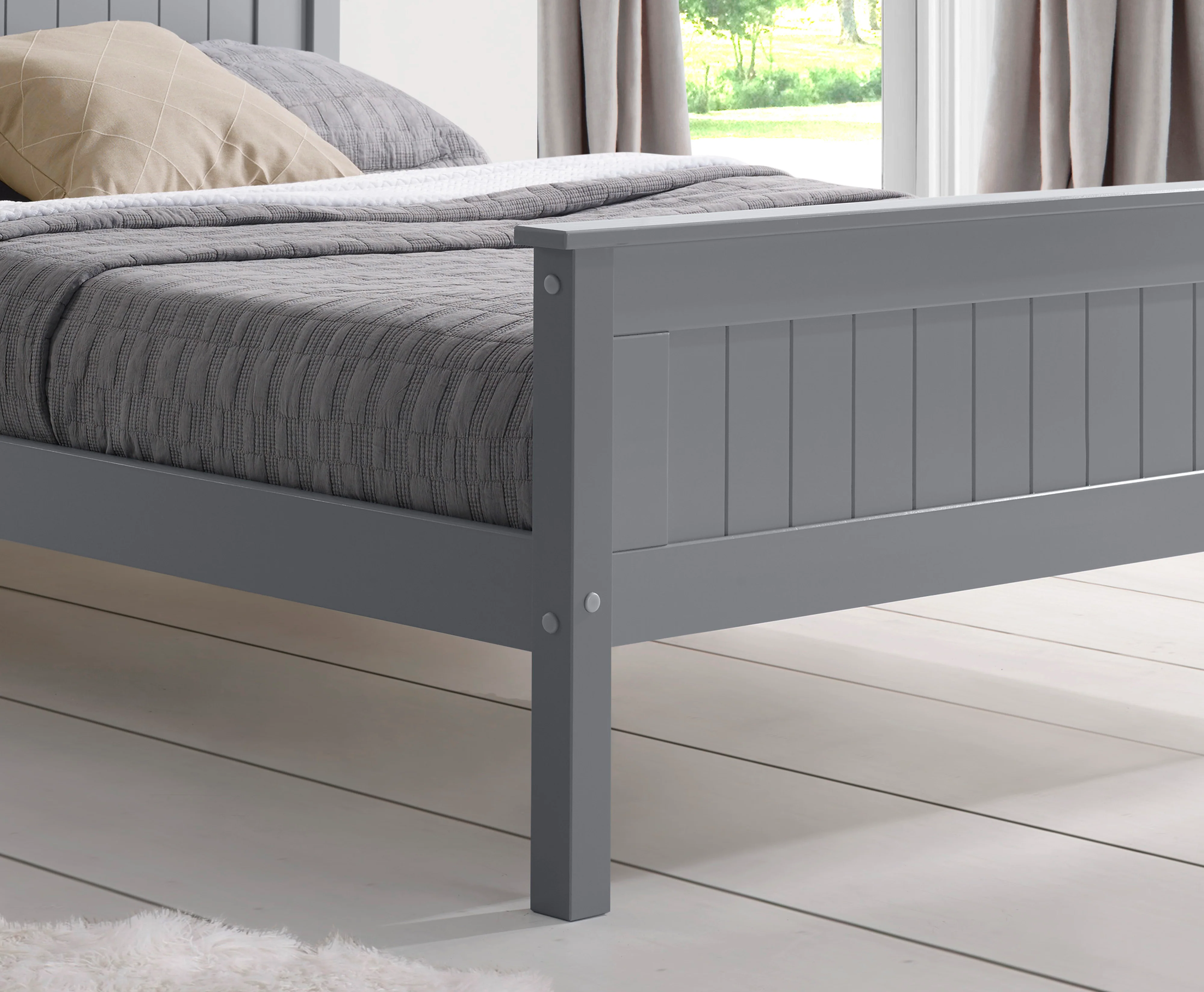 A grey painted finish cleans up this bedstead to make it perfect for the lighter home. Simple detail allows your accessories to take the spotlight.